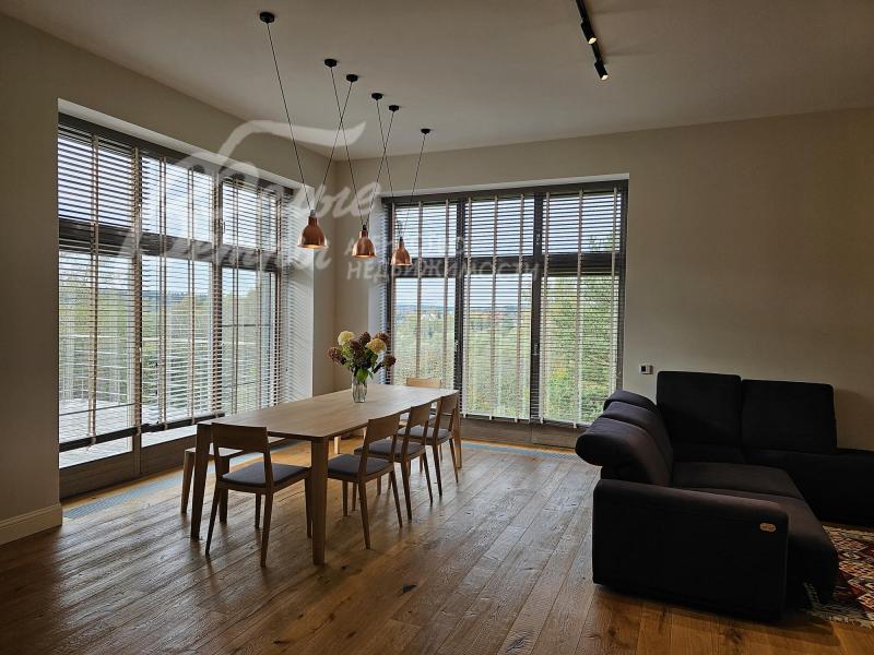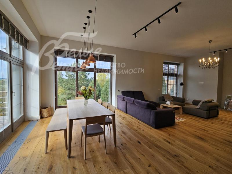 Мебель, оборудование: выполнена мебельная расстановка по принципу функциональности и эргономики: каждый предмет имеет свое предназначение и расположение, нет перегруженности, сохраняется воздушность интерьера и простор. Лаконичный интерьер отражает экологический подход к жизни. Мебель простых форм выполнена, в основном, из натурального светлого дерева - массива дуба. Большая часть мебели - бренда Javorina (Словакия). В кухне установлены: гарнитур с фасадами из массива дуба (ARAN, Италия) со столешницей из искусственного камня и встроенной бытовой техникой (KUPPERSBUSCH): духовка, микроволновая печь, варочная панель, посудомойка XL, холодильник двухстворчатый (Franke, Швецария), вытяжка (Elica, Италия), обеденная группа со столом длиной 2,8 м, 5-ю стульями и скамьей, полубарные стулья вокруг кухонного острова. В детской спальне – кровать с тумбами. В мастер-спальне – большое зеркало и комоды. В прихожей - 2 вешалки. Часть мебели и отделочных материалов выполнены на заказ отечественными мастерами: столешница барного стола из массива дуба, столики в санузлах под раковины (7 шт), отделка ступеней лестницы. Элементы акцентного освещения над столом в гостиной и в мастер-спальне – светильник и бра бренда LAMPE GRAS, Франция (модель Acrobat). Во всех санузлах – раковины на столиках из массива дерева (брашированного, искусственно состаренного, исполнение в скандинавском стиле), установлена сантехника брендов Laufen и Jacob Delafon, две отдельно стоящие ванны с напольными смесителями. Интерьер украшают шторы-жалюзи из дерева. Предусмотрена ниша для освещения в стеновом стеллаже между кухней и гостиной
