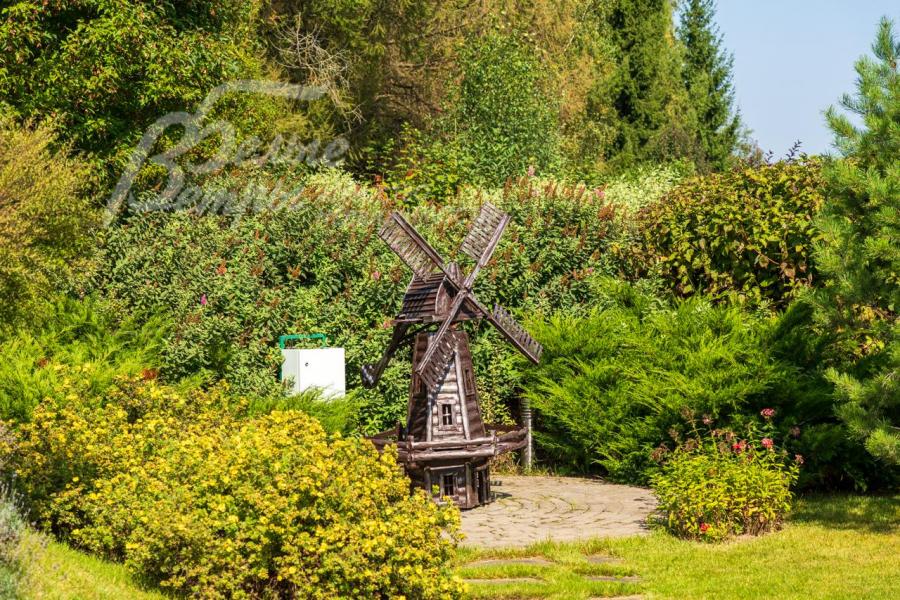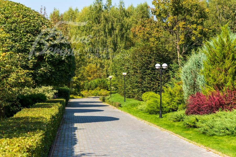 Благоустройство участка: ландшафтные работы, газон, посадки (туи, кустарники), система автоматического полива, дорожки из камня, уличное освещение